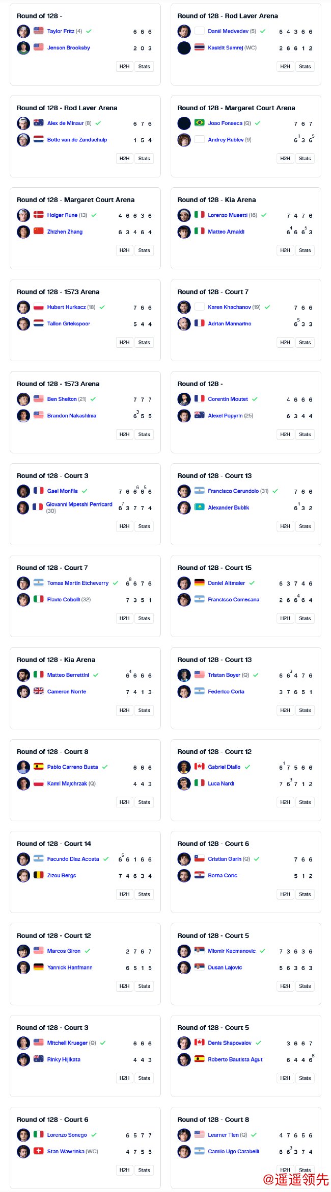 除中国选手的比赛外,4号种子弗里茨仅丢5局就直落三盘,以6-2/6-0/6-3轻取复出的同胞布鲁克斯比,顺利取得开门红。